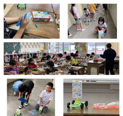 今日は教材を組み立て、帆に風を当てて車を走らせています。