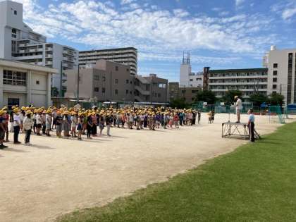 今朝は少し蒸し暑いですが、良いお天気にも恵まれ、久しぶりに運動場での児童朝会から今週もスタートしました。