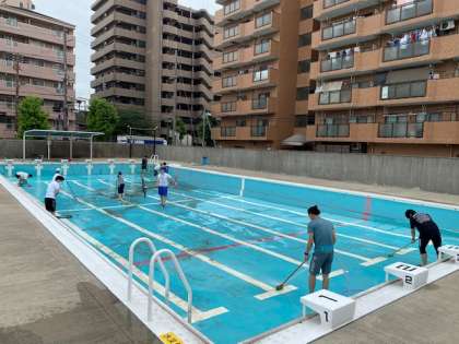 ひっこしドッジビーのライン引き&プール清掃