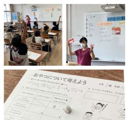 3年生では栄養職員による、栄養指導「おやつについて考えよう」の授業を行いました。