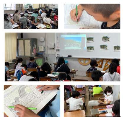 今日の4年生図工では、来月玄関掲示のモチーフとなる、国が指定する名勝、山口県岩国市にあります「錦帯橋」の色付け練習を行なっていました。