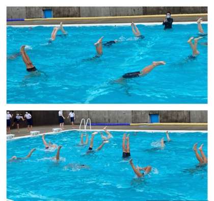 残念ながら数名の見学者はいたものの、担任の先生の合図で、入水者全員で6年間お世話になったプールに感謝の気持ちを込めた??「逆立ち」を披露してくれました。