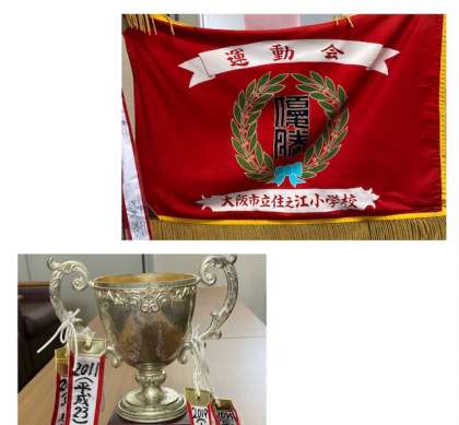 「スミフェス2021」の開催に向けて、優勝旗、準優勝カップが校長室に置かれています。