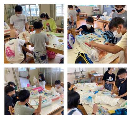 タオルに水粘土を染み込ませ、形を意図せず乾燥させて固まったものを見て、それぞれが何見えるかを想像し、着色して作品に仕上げる様子を拝見しました。