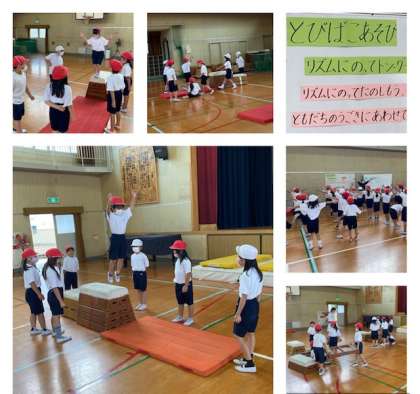 跳び箱遊びでは、飛び乗ったり、ジャンプして飛び降りたりとリズム良く進んでいきます。