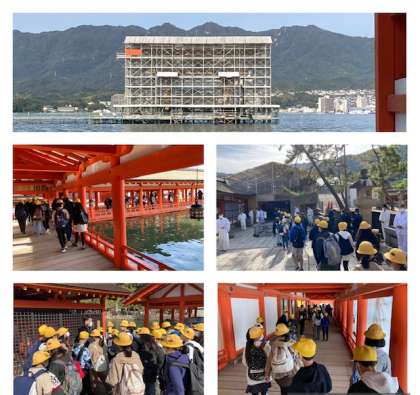 厳島神社に到着し拝観中です。 大鳥居の改修もあと少しの様です。