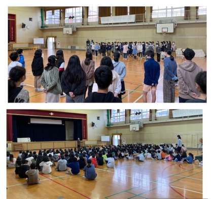 今朝の児童朝会では、来週行われるピースフェスティバルの際にみんなで歌う「地球星歌」の隊形移動の学習と、高学年は歌の学習も行いました。