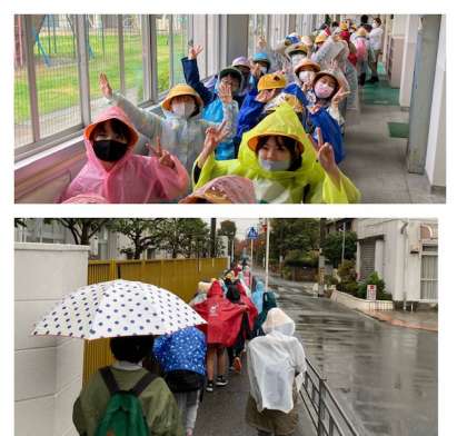生憎の雨ではありますが、3年生のみんなは雨ガッパを着て、元気に学校を出発しました。