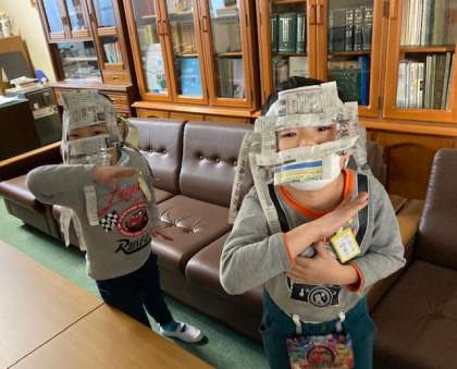 実は、2年生の生活科の授業で、新聞紙を使って忍者の仮面を作ったそうです。