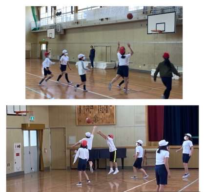 5年生の体育では、体育館でバスケットボールを行っています。