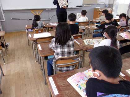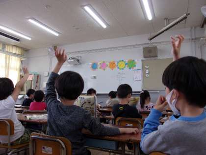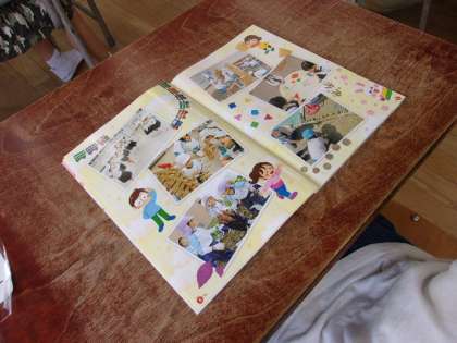 算数の教科書を見ながら、先生の質問に答えていました。元気よく手をあげて発表できていました。