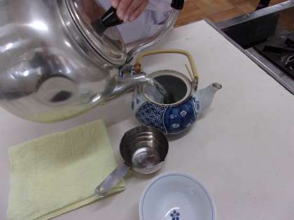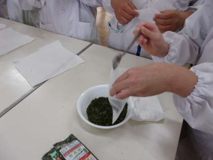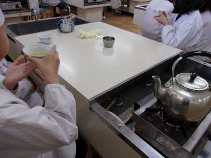 お茶の葉をパックに入れてきゅうすに湯を注ぎました。自分たちでいれたお茶を飲みました。おいしいという感想をもった人が多かったようです。
