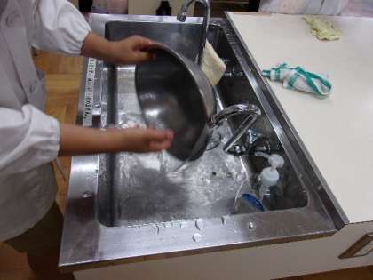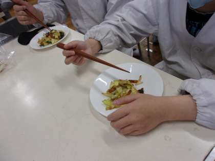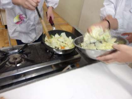切った野菜を炒めました。できた野菜炒めは、みんなでいただきました。片付けもしっかりと行うことができました。