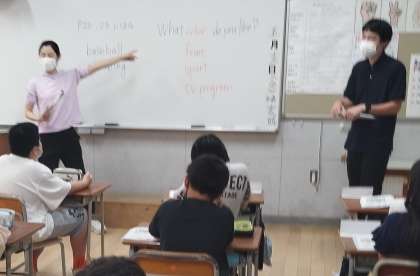 5月13日 外国語(英語)の授業で、好きなものをたずねて、答える会話を学びました。What○○do you like?の○○の部分に色や果物、スポーツを入れて、I like○○で答えます。先生に教えてもらった後、クラスメ−トと練習しました。