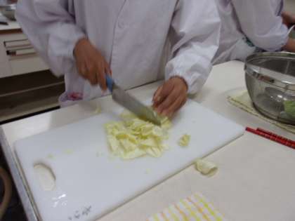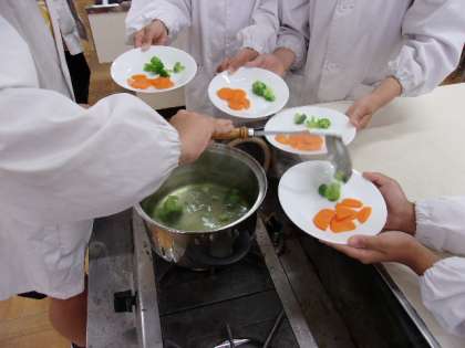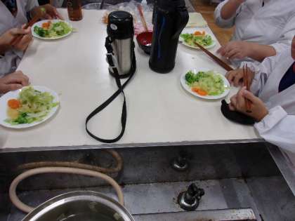 5月17日 5年生が2回目の調理実習を行いました。キャベツ・ブロッコリー・にんじんを切って、ゆでました。ドレッシングは、しょうゆ・酢・ゴマ油を混ぜて自分たちで作りました。「ブロッコリーがやわらかい」「おいしい」と言いながら食べていました。