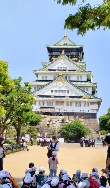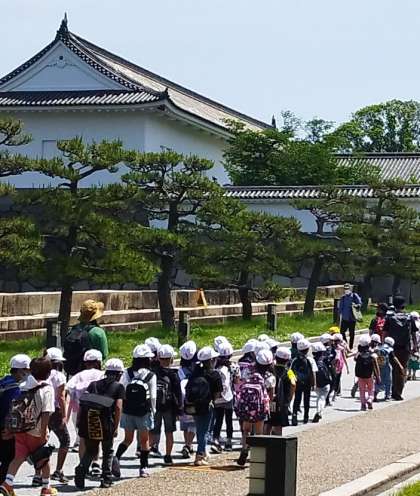 5月18日 1.2年生は大阪城公園に遠足に来ています。暑い中ですが、がんばって歩いています。大阪城の前でクラスごとに写真をとりました。