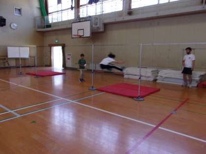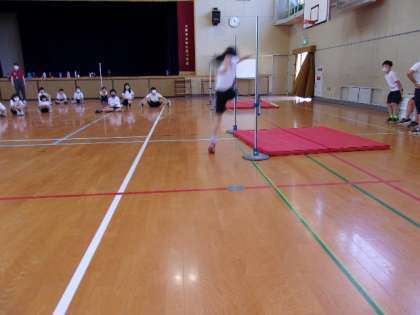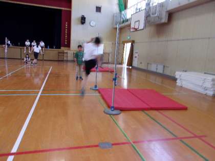 6月9日 体育で高とびをしています。はさみとびで、フォーム、とくに足をぬく動作に気ををつけながら、練習していました。