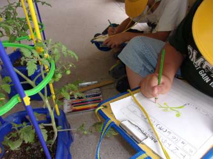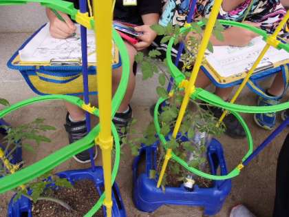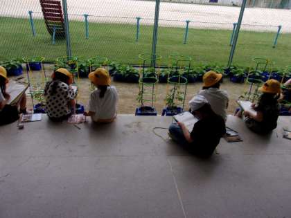 6月16日 生活科でトマトを育てています。今日は、育っている様子を記録しました。定規を使って実のサイズをはかったり、スケッチしたりしました。大きく育ってほしいですね。