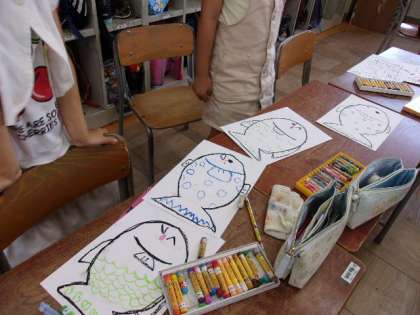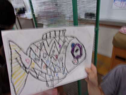 6月23日 図工で魚の絵をかきました。うろこや顔をじぶんなりに工夫してオリジナルの魚を完成させることができました。玄関に掲示するのでまた見てください。