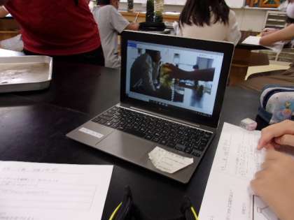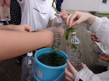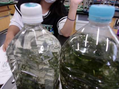 7月11日 理科で光合成の実験をしました。ペットボトル内の水草が出した酸素に火をつけた線香を近づけると炎が大きくなりました。植物は日光が当たると光合成により酸素を出すことがわかりました。