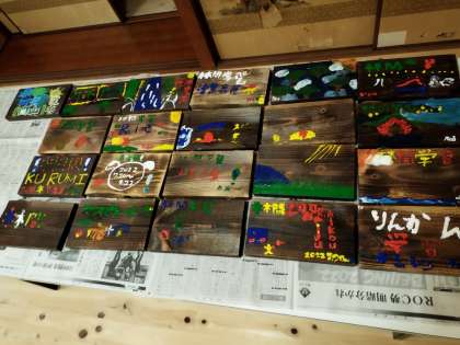 5年生が林間学習の思い出などを焼き板に表現しました。