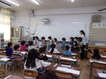 9月29日 算数でひき算を学習しています。問題場面で、8人がのった電車から1駅目で3人おり、2駅目で2人おりると、電車内に残っている人は何んになりますかということを視覚的に理解できるように実際にこどもたちが動きました。ノートもしっかり書いて学習することができました。