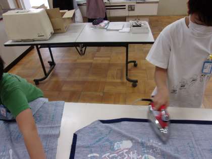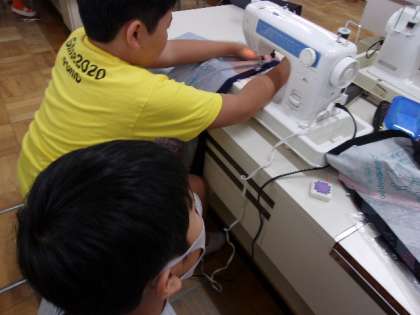 10月3日 ミシンを使って、エプロン制作に取り組んでいます。ミシンで縫う前に、縫う部分を折り、アイロンをかけて、縫う部分がずれないようにしました。できあがりが楽しみです。