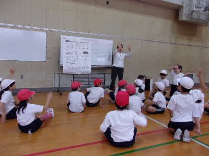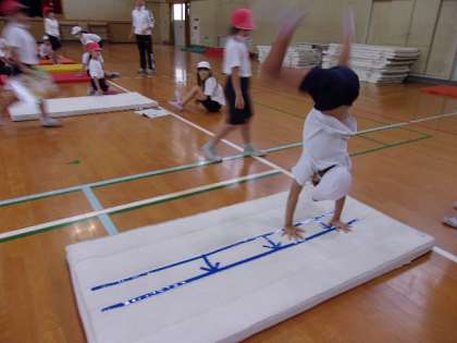 10月27日 マット運動に取り組んでいます。今日は、後転と側転を練習しました。マットに足をつくとき、目印におさまるようにフォームに気をつけながら練習しました。