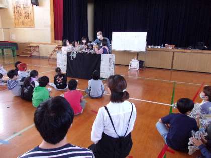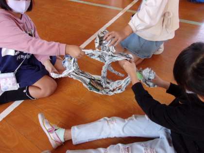 11月2日 文化庁の事業で、コミュニケーション能力を高めることを目的として、劇団「クラルテ」による出張授業が行われました。新聞紙で人形を作り、孫の祖父母の会話などの場面を設定し、コミュニケーションの練習をしました。