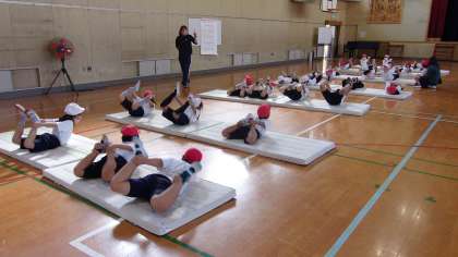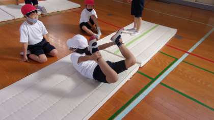 11月7日 体育でマット運動、体づくりに取り組んでいます。今日は体をそらす動きを練習しました。