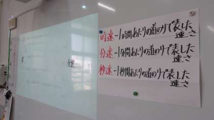 11月8日 算数で速度について学習しています。単位をそろえるということが、こどもたちにとってはなかなかやっかいです。Km m 時 分 秒 をそろえて計算することにがんばりました。
