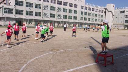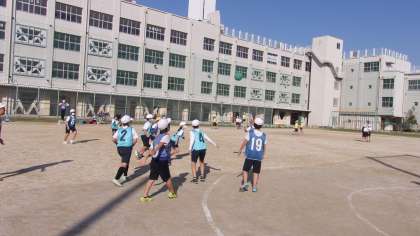 11月15日 体育でポートボールの学習をしています。チームでパスを回しながら、ドリブルしながら、シュートにつなげていきます。