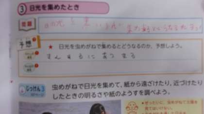 11月29日 理科で日光を集めるとどうなるかについて学習しています。前時間に虫眼鏡で日光を集めて黒い紙に当てると煙が出てさらに当てると炎が出て紙が焼けました。そのことから日光には熱があるということをまとめることができました。