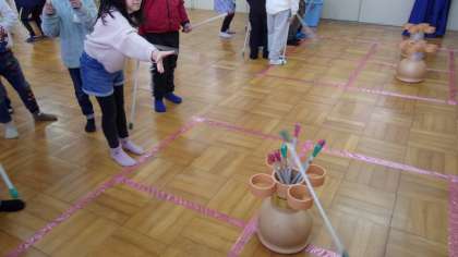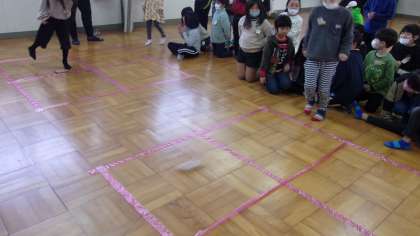 12月12日 国際理解教育の一環として、学級活動で韓国の遊びを体験しました。ソンセンニム(韓国の先生)に来ていただき、遊び方を教えていただき、自分たちもやってみました。「トルチャギ」(けんぱ)で、けんけんしながら力加減を調節して板をけるのが、なかなか難しそうでした。「トゥホ」はいれものに少し離れたところから矢を投げて入れるという遊びです。いろいろな文化にふれて、知識とともに考え方も広げてほしいと思います。