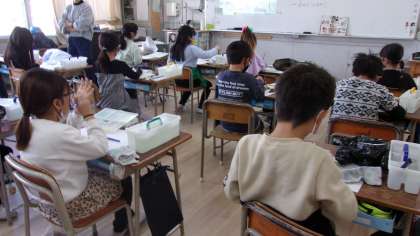 12月14日 図工「身近な自然の形・色」という単元で、落ち葉を使って作品を作ります。画用紙の上に落ち葉を並べて、どんな作品ができそうかイメージしました。