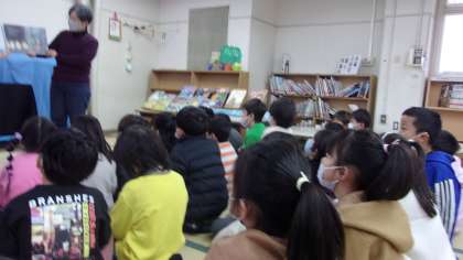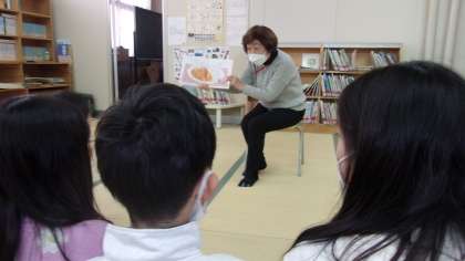 1月26日 読み聞かせボランティア「ぴよぴよ」の方に読み聞かせをしていただきました。2時限目に1年生、15分休憩に聞きたい人が集まりました。本の中に食べ物(オムライス、カレーなど)が出てくると、「食べたいなあ」という声が出ていました。