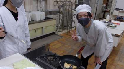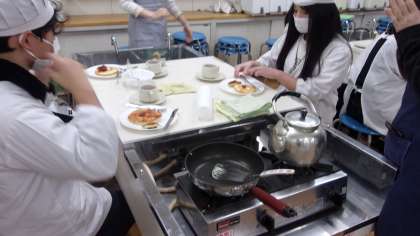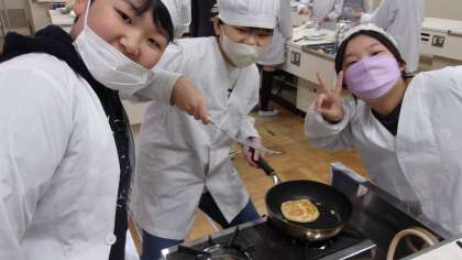 1月27日 家庭科で調理実習をしました。パンケーキを焼き、紅茶を作りました。パンケーキをフライ返しでひっくり返すのが少し難しそうでした。