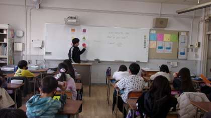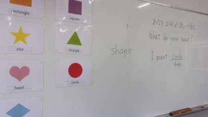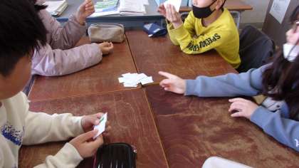 2月9日 英語で「何が好きですか?」「私は○○が好きです。」の言い方を学びました。○○の部分を今日は、形で言いました。三角形(トライアングル)、四角形(スクエア)、星(スター)などです。カードをとるゲームをしながら覚えました。