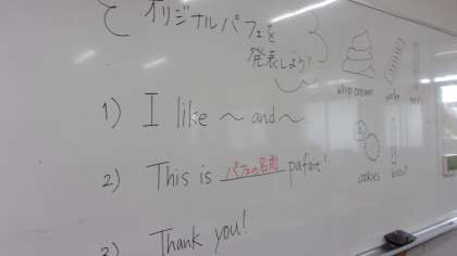 2月9日 英語で「私は○○のパフェが好きです。」の言い方を学びました。まず自分でパフェの中身を選びオリジナルのパフェを決めました。そのあと、みんなの前で発表しました。