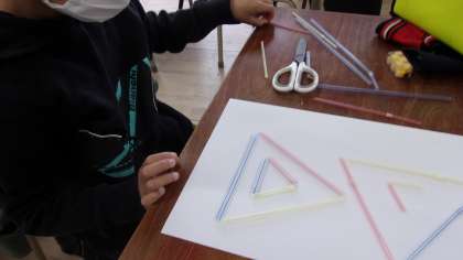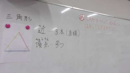 2月10日 算数で三角形や四角形について学習しています。今日は、三角形の辺と角、頂点の数はそれぞれいくつなのかを確認しました。