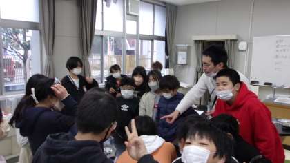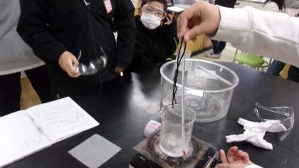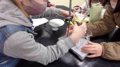 2月10日 理科でものの溶けかたについて学習しています。ミョウバンと食塩を60度の水に溶かした後、冷えるとどうなるのか実験しました。またろ過する方法を学びました。