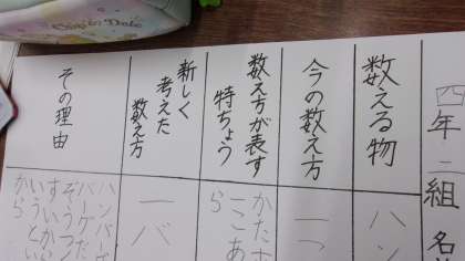 2月13日 国語「日本語の数え方について考えよう」に取り組んでいます。それぞれのものの数え方(本・冊・個・人・匹など)を確かめ、自分なりの新たな数え方を考えるというものです。考えたことを画用紙に表しました。