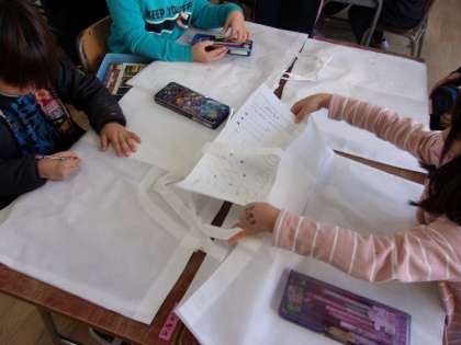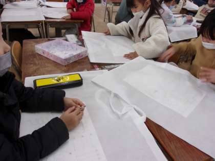 3月1日 図工で1年生最後の作品をつくります。不織布の白い入れ物にデザインをします。完成したら、この1年の間に制作した様々な作品を入れて持ち帰ります。