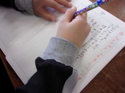 3月2日 国語で説明文「人をつつむ形」について学習しています。意見文を書き、発表することに取り組みました。