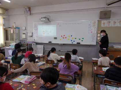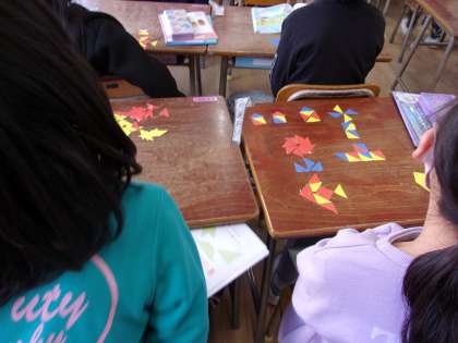 3月3日 算数で形について学習しています。形の組み合わせで、様々な模様などを作ります。図形の学習の初歩です。