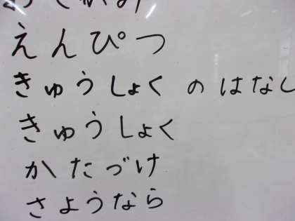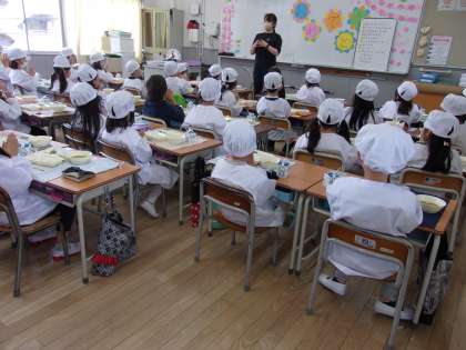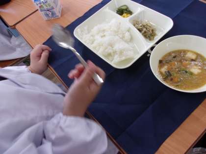 4月11日 今日から給食が始まりました。1年生は初めての給食なので、給食の進め方のお話を聞きました。