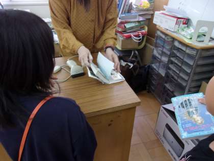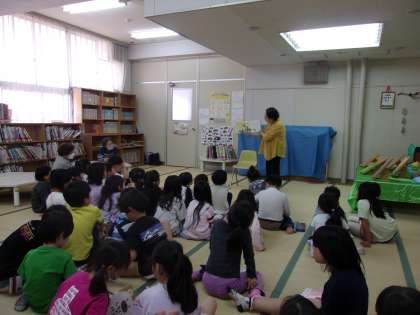 5月11日 1年生は2時間目に図書の時間に本をかりました。15分休憩には読み聞かせボランティア「ぴよぴよ」の方に絵本を読んでもらいました。