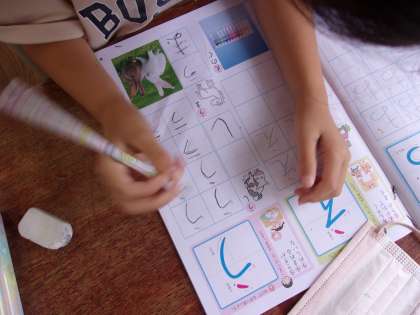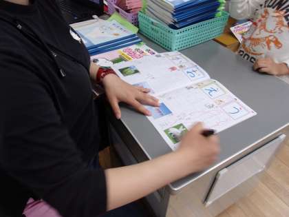 5月19日 ひらがな「う」を書きました。お手本からはみ出さないようになぞり、その後自分で書きました。