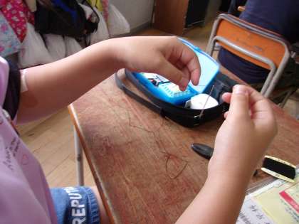 6月6日 家庭科で、針に糸を通しました。糸をななめに切って先を細くして通しました。これから練習用布になみぬいなど何種類か縫い方を試していきます。