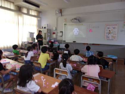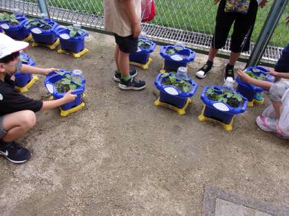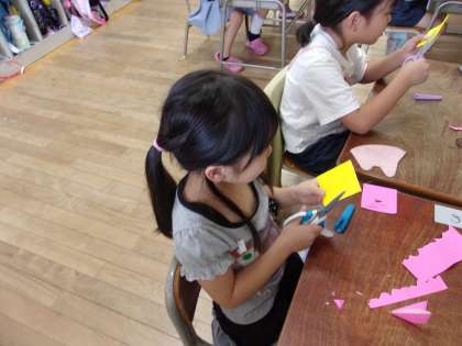 6月14日 図画工作で折り紙を使ってかざりを作りました。4つ折りにした折り紙をはさみで切ると同じ模様がつながったものができます。こどもたちはできあがった作品を見てとても喜んでいました。また生活科では育てているあさがおの観察をしました。